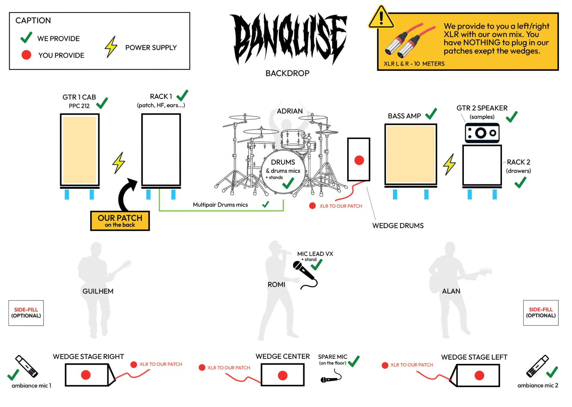 - - Voir plan de scène ci-joint pour emplacements musiciens et alimentations électriques backline.