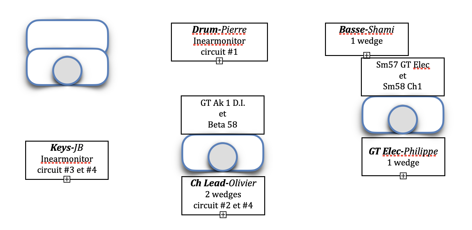 - Wedges : 4 wedges (dont 2 pfls) sur 4 circuits. Type L'ACOUSTIC MTD115XT HiQ, 115FM, D&B MAX 15, NEXO PS15.