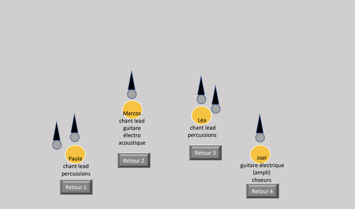 o L’espace scénique devra être équipé au minimum de de 4 retours wedges (cf OUTPUT PATCH & PLAN DE SCENE)