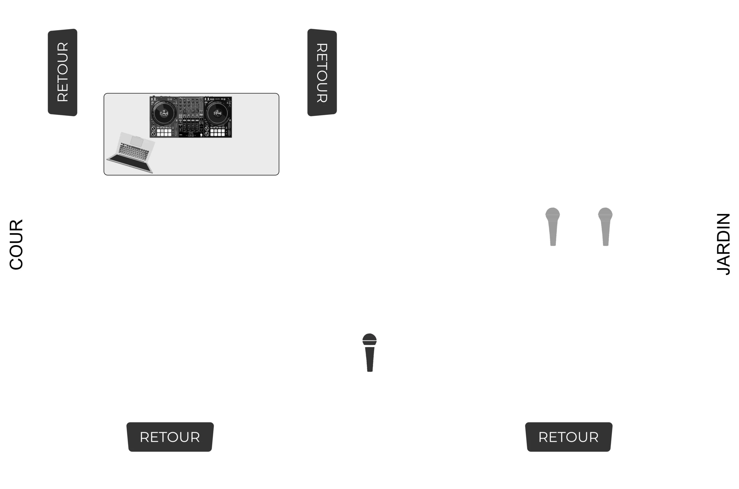 - ✓ L’organisateur fournira un praticable juppé en noir (impératif) pour le DJ – hauteur 1m. Nous pourrons apposer un drap avec logo à l’avant de ce praticable.